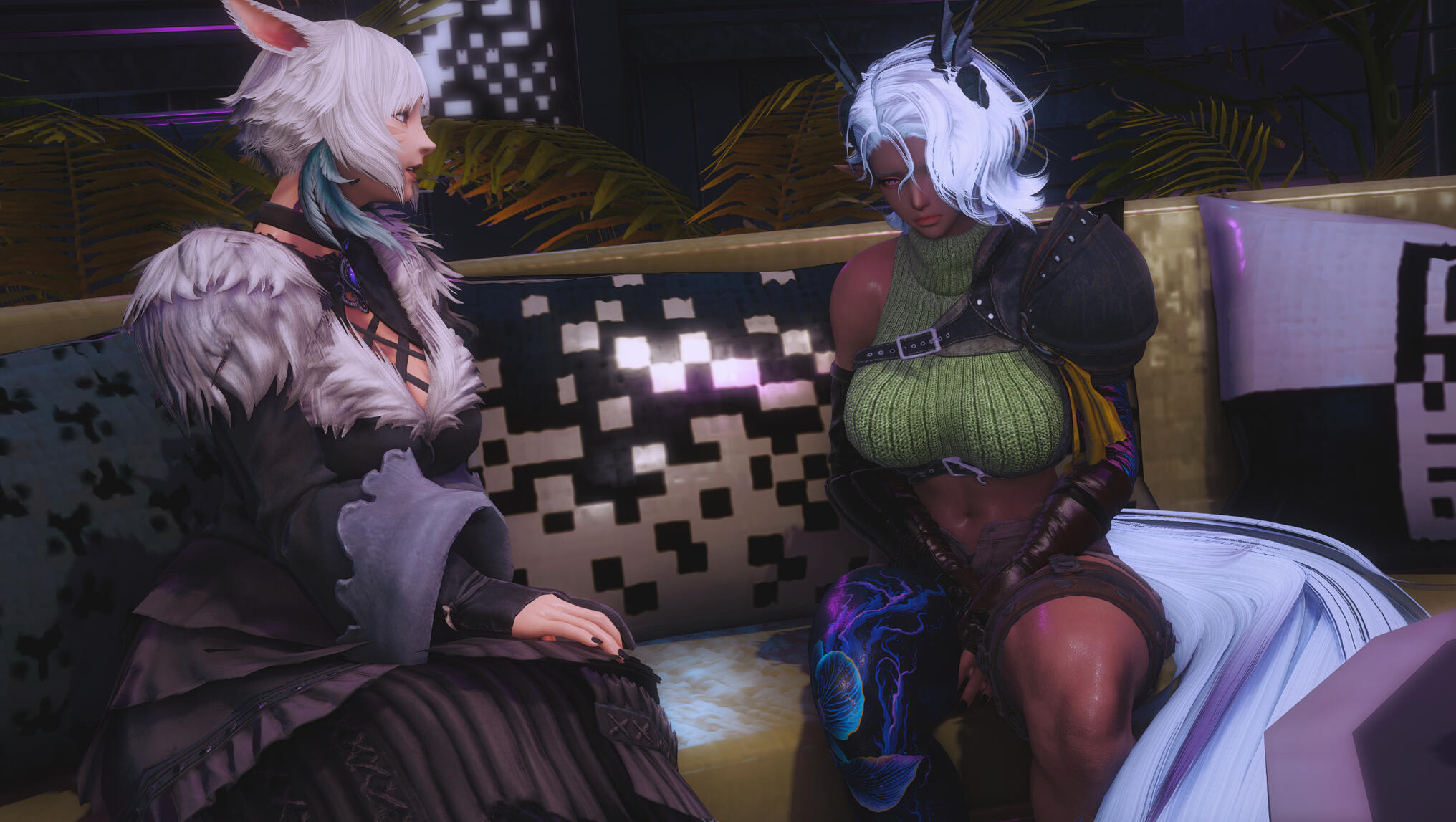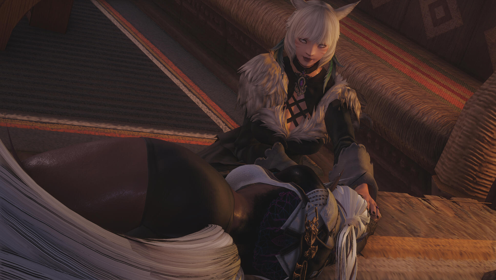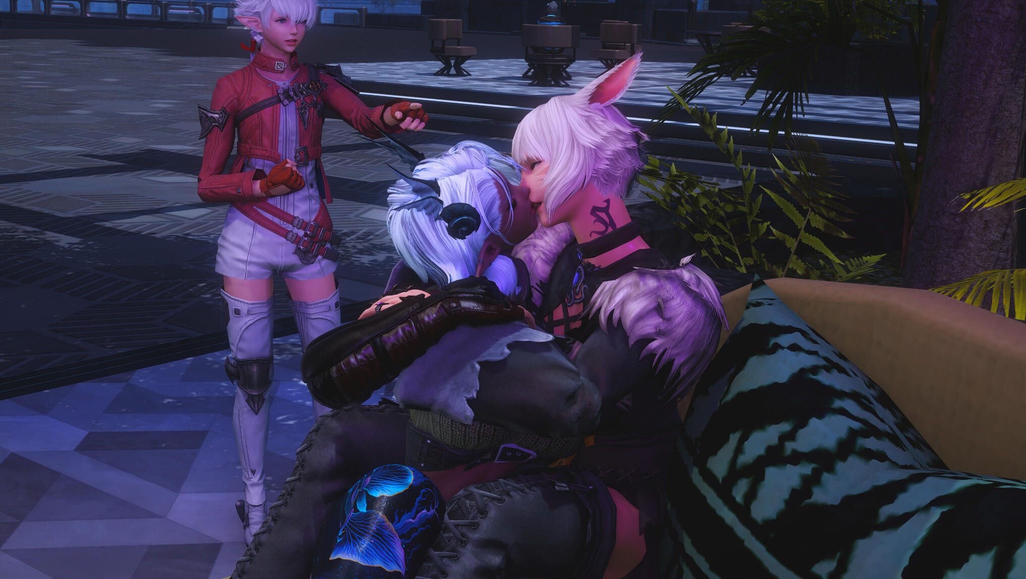 Weeks slipped by since the fall of the Calyx of the Endless, its shadow scattered by Aldra and her companions. In the calm that followed, Y’shtola lingered ever nearer, weaving herself into the rhythm of Aldra’s days with patient grace. Each time Aldra shyly asked her about love—how to name it, how to share it—Y’shtola answered with gentle wisdom, soothing her uncertainty while quietly guiding her heart.To Alisaie, the sight was almost endearing: Aldra leaning closer, her every glance betraying a kind of quiet swooning, her admiration blooming like spring. A touch of concern nagged at her, but she chose instead to smile, believing love was finally finding its way between them.But beneath Y’shtola’s calm replies and tender smiles stirred a deeper truth. She was not merely answering Aldra’s questions—she was shaping them, turning each word, each moment, into a thread that bound the dragon princess ever closer. And with every heartbeat, the web tightened—sweet to behold, yet edged with something far more dangerous.”
